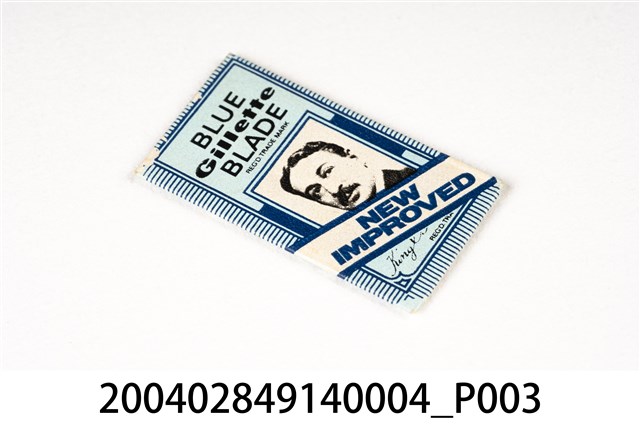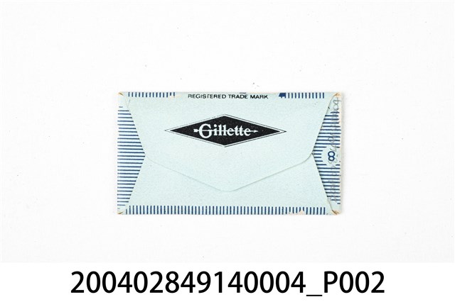 本件吉列藍刀刮鬍刀片為吉列藍刀安全式刮鬍刀組之部件4,可分為外包裝紙與單片式刀片,呈長2.6公分,寬4.7公分,高0.1公分。包裝紙作黑、藍雙色印刷,正面呈直式長方形版面,框外緻密之連續線條向外延伸至背面,框面以淡藍色為底,上端印有「BLUE Gillette BLADE」,中央處又作長方形框,內置黑白色吉列創始人King C. Gillette之頭像。並以斜下45度之藍色帶狀框,內印「NEW IMPROVED」。背面則印有黑色橫式長菱形標誌,內有白色以箭矢穿之「Gillette」字樣。