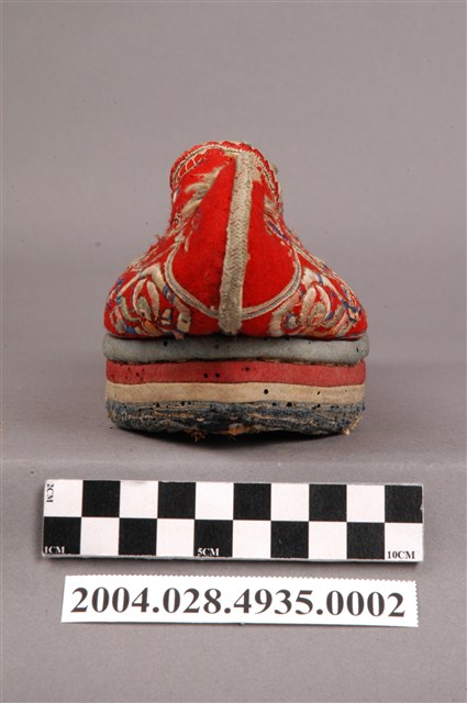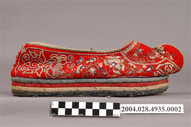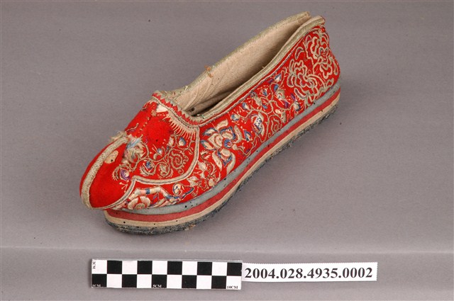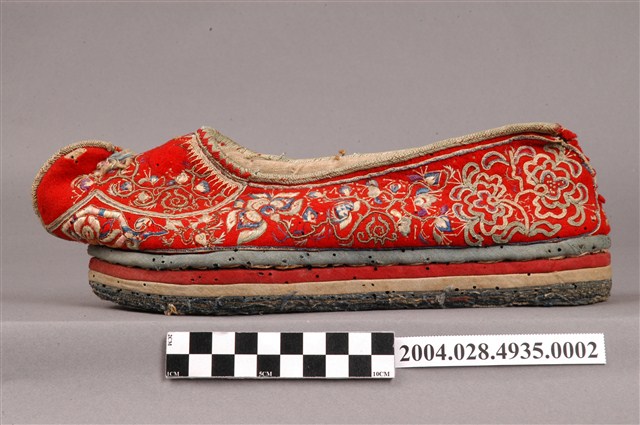 紅毛料刺繡翹頭鞋右腳,翹鞋以紅色毛料製作,鞋後跟原是左右分開的形式,後來用紅色絲線綴縫起來,鞋幫上以各色絲線、金屬紗線和細織帶,盤曲捲繞刺繡出花卉圖案,佈滿整個鞋幫。鞋口緣以淺綠色絲線做交叉結邊,前端鞋鼻翹起部分以三角鎖邊刺繡處理,外緣再以細織帶釘縫點綴,整體造型華美而亮麗,光彩奪目富有生命活力。鞋底為古老納鞋方式製作,鞋內底部以棉布襯底並以麻線納縫,鞋底分為四層納布,層次豐富而且整體造型華美富麗。此鞋子上有許多蛀蟲的孔洞(鞋底、鞋面都有),繡線也有局部脫線,鞋後跟的縫線也有脫落的情形。
