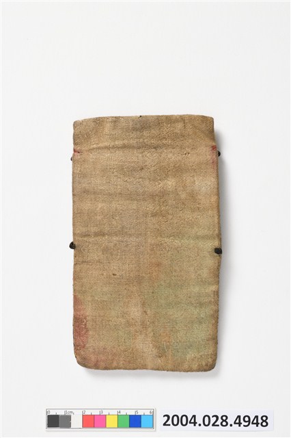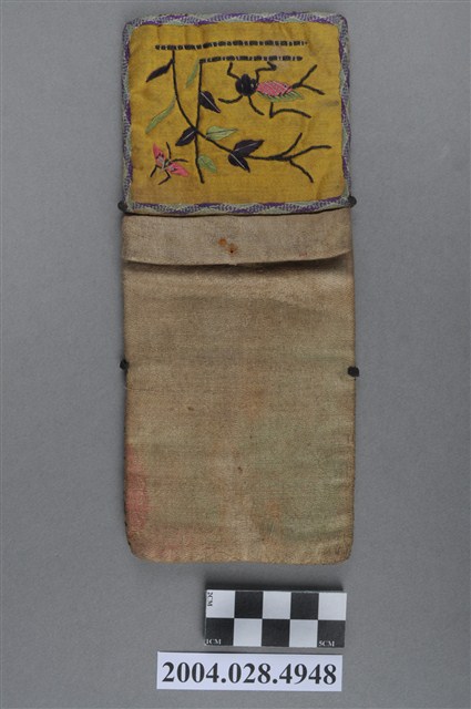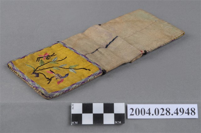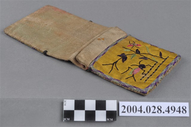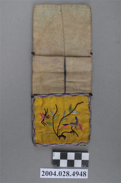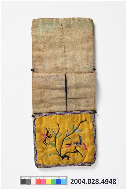 1. 此件為雙口袋褡褳,是將兩個黃色袋面分別綴縫在白色棉布的兩端,配戴時對折掛在腰帶上,讓兩個袋面朝向同方向。材料使用上,雙袋面均使用黃色絲緞作底布,週邊使用綠、紫相間的織帶貼飾,既美觀又能增加耐用度。刺繡紋飾方面,上方袋面繡有代表生衍能力強盛的草蟲以及美麗的蝴蝶,在葉間飛舞、佇立,下方袋面繡有在花葉與蝴蝶,蝴蝶諧音福耋,代表福氣與長壽。刺繡技巧方面,則使用釘線繡、纏針、鋪針、紮針以打籽繡等技法,讓簡練的圖紋富有變化。2. 繡荷包為常見掛飾於腰間的囊袋,用於收納隨身小物,通常有方形、雞心型、橢圓形以及褡褳等造型,並且有精細的織繡,兼具美觀與實用。