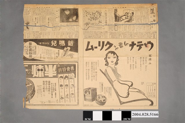 此為1935年(昭和10年)3月31日《臺灣日日新報》第5、6版,另兩版面板標被撕毀無法判別,內容計有〈天使〉(橫光利一)、〈日本棋院秋季大手合戰譜〉(先番:二段田中不二男、先相先:初段塚越常康)、〈獨逸マタドール映畫 夢みる唇 四月三日より榮座で公開〉、〈「外人部隊」が世界を席捲〉、〈マーナ‧ロイが男裝の麗人達に 皮肉な回答〉、〈ハリウッド特報:傑作十二映畫 豫選發表さる〉、〈東京發聲で新映畫を作製 藤井大日方が主演〉等等,以及多樣商品廣告。 此物件代表的《臺灣日日新報》為臺灣日治時期創辦,並偏向日本官方立場的報紙,也被稱為總督府的「御用報紙」。《臺灣日日新報》並非日治時期最早創辦的報紙,是由1896創辦的《臺灣新報》以及1897年創辦的《臺灣日報》合併而成。其後《臺灣日日新報》與《臺南新報》、《臺灣新聞》共三報被合稱「臺灣三大御用新聞」,同時也是臺灣當時最大的報社,最終在日治末期的1944年將臺北《臺灣日日新報》、《興南新聞》、臺中《臺灣新聞》、臺南《臺灣日報》、高雄《高雄新報》、花蓮《東臺灣新報》五大報合併為《臺灣新報》,而在戰後《臺灣新報》被國民政府接收改為《臺灣新生報》。(何義麟,2015:26-27) 日治時期的臺灣報紙,就發行機構的性質可分為官、民兩類。在官方方面,有總督府發行的《府報》,以及各州、縣、市、庄等地方政府發行的地方報,如:《臺北州報》。民間方面則有言論親近官方的《臺灣日日新報》、《臺灣新聞》、《臺南新報》,而貼近民眾立場的報紙則以《臺灣民報》為代表。由於總督府嚴格的出版限制,使得報刊出版門檻甚高,得以籌辦刊物者通常為財團、大型組織或具備豐厚資產者。