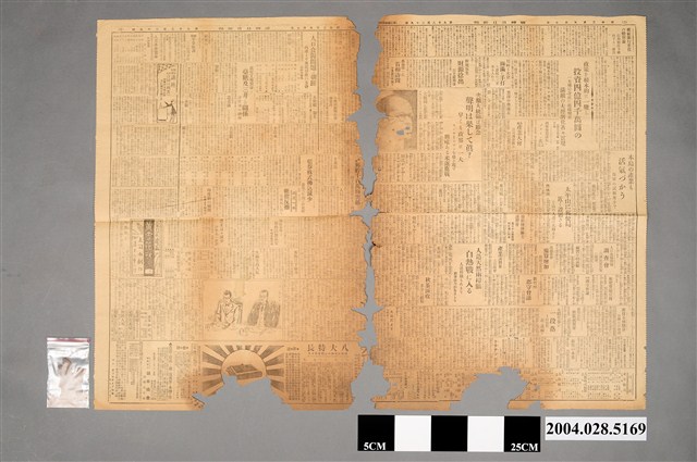 此為1927年(昭和2年)9月7日《臺灣日日新報朝刊》第1至4版,內容計有〈總督不遠出巡日程未定〉、〈峰憲兵司令官視察動靜〉、〈北州產組講習舉發會式〉、〈長官公室食糧調查會〉、〈彰化郡街庄長會議〉、〈汐止嶤山設立模範茶葉公司〉、〈屏東潮州農會寄米新記錄〉、〈臺北早稻坪刈成績優于昨年同期〉、〈潮州郡枋寮籌設漁組〉、〈產組大會出品臺南州之分〉、〈臺南水源地補修工事〉、〈發動機關士講習會〉、〈新事業之財源捻出 藏相大費躊躇〉、〈後藤子就任外相說〉、〈行政裁判改正內務省不甚贊成〉、〈英海軍掃蕩海賊焚燬房屋砲擊村落〉、〈馬二又將乘隙而出〉、〈共產軍稱將襲汕頭〉、〈廣東硬派民款延期〉、〈上海為英有助孫之疑擬再開始排英運動〉、〈蔣介石將亡命日本〉、〈武漢南京通電合作〉、〈瀛社觀月會 會場假龍山寺〉、〈震害後之鹽水街借入低資亟謀復興〉、〈大園鎮福宮預定下旬竣工〉、〈大溪建醮〉、〈金協和媽祖過爐〉、〈臺灣民眾黨臺北支部六月發會式〉、〈民眾黨大講演為設嘉義支部〉、〈為豫防虎疫侵入 禁止使用淡水河水〉、〈臺南市內腸疫漸近終熄〉、〈大稻埕藝娼妓多未入檢番最近檢舉〉、〈景美瑠公橋改善歟改惡歟〉、〈橫領前金〉、〈破綻銀行重役の體刑論〉、〈政策を根本的に一變し投資四億四千萬圓の一大殊特會社組織變更滿鐵の大經濟化著々實現〉、〈川崎と大倉圓滿に手打〉、〈新規事業財源捻出〉、〈本島の產業も活氣つかう海軍の試掘著手で〉、〈太平山に郵便局近く設置さる〉、〈人造天然兩樟腦白熱戰に入る〉、〈人口食糧問題と朝鮮 內地より移民招致の方針〉、〈旗尾工場賣却と臺糖及三井との關係〉、〈債券株式拂込減少〉、〈商況一束糖價反撥〉等等,另刊載多篇商業廣告。 此物件代表的《臺灣日日新報》為臺灣日治時期創辦,並偏向日本官方立場的報紙,也被稱為總督府的「御用報紙」。《臺灣日日新報》並非日治時期最早創辦的報紙,是由1896創辦的《臺灣新報》以及1897年創辦的《臺灣日報》合併而成。其後《臺灣日日新報》與《臺南新報》、《臺灣新聞》共三報被合稱「臺灣三大御用新聞」,同時也是臺灣當時最大的報社,最終在日治末期的1944年將臺北《臺灣日日新報》、《興南新聞》、臺中《臺灣新聞》、臺南《臺灣日報》、高雄《高雄新報》、花蓮《東臺灣新報》五大報合併為《臺灣新報》,而在戰後《臺灣新報》被國民政府接收改為《臺灣新生報》。(何義麟,2015:26-27) 日治時期的臺灣報紙,就發行機構的性質可分為官、民兩類。在官方方面,有總督府發行的《府報》,以及各州、縣、市、庄等地方政府發行的地方報,如:《臺北州報》。民間方面則有言論親近官方的《臺灣日日新報》、《臺灣新聞》、《臺南新報》,而貼近民眾立場的報紙則以《臺灣民報》為代表。由於總督府嚴格的出版限制,使得報刊出版門檻甚高,得以籌辦刊物者通常為財團、大型組織或具備豐厚資產者。