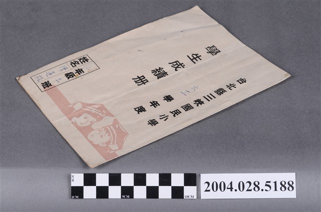 本文物為學生成績表冊,封面下面男童女童帶方形帽的圖案,乃61學年度台北縣三峽國民小學二年三班學生的成績冊,姓名為陳蓬桂。
