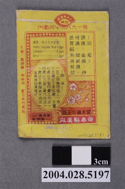 1. 本物件為榮泰頭痛散之包裝。封面上方有註冊商標和成藥兩字,印有頭痛齒痛最新藥、榮泰頭痛散、頭痛齒痛最難受、榮泰頭痛散可救和榮泰製藥廠等字樣。封面正中間有兩個頭像,一人扶頭,一人扶臉頰。背面則印有內衛成字第861號、成分(醋柳酸、咖啡因等)、主治效能(頭痛、齒痛、神經痛等)、用法用量和製藥廠資訊等。