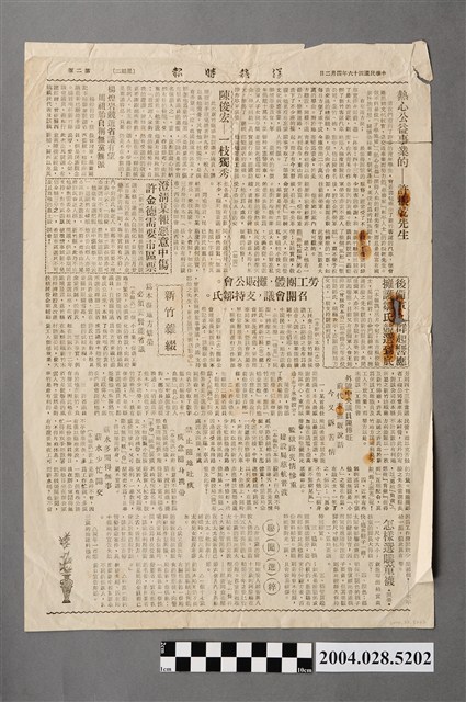 本物件為《洋裁時報》第三十五期,民國46年4月2日出版。第一版上列有報社相關登記資料 (創刊為民國45年1月31日 )及廣告二則:「柑桔菓樹苗圃中美農園劉火土新埔鎮中正路三七三」、「臺灣工礦股份有限公司董事長許金德 社址台北市懷寧街四號」;頭版報導主題有「一工人談論:新竹選局-無限辛酸話桑梓」、「運用智慧選賢與能 訂選民選舉須知」;第二版主題報導:「熱心公益事業的-許振乾先生」、「陳俊宏一枝獨秀」、「楊煌岩競選省議有望 周祖胎自稱無黨無派」、「澄清某報惡意中傷 許金德需要市區票」、「後備軍人群起響應 擁護鄒氏競選到底」、「勞工團體,攤販公會,召開會議,支持鄒氏。」以及新竹本地雜聞「新竹雜綴」:「為本縣地方繁榮 必須要賢能省議」、「外號中央議員陳傳旺 前代表攤販說話 今又訴苦情」、「監獄路災情慘重 建設局慈航普渡」、「禁止隨地吐痰 痰盒隨身攜帶」、「薪水多閒得無事 薪水少忙開交」、二版末有專文「怎樣選購童襪」及「趣聞選粹」