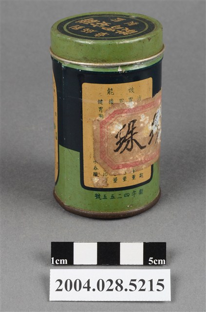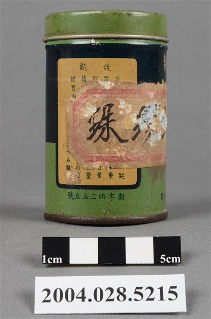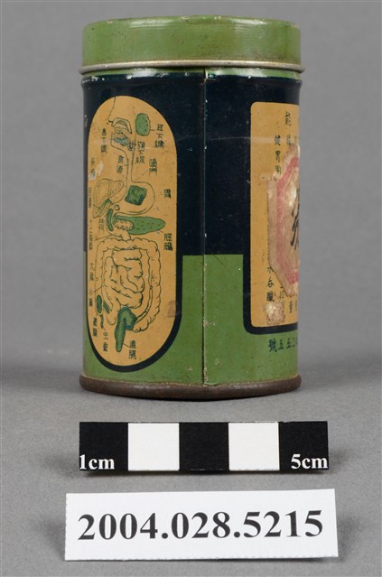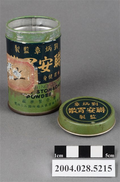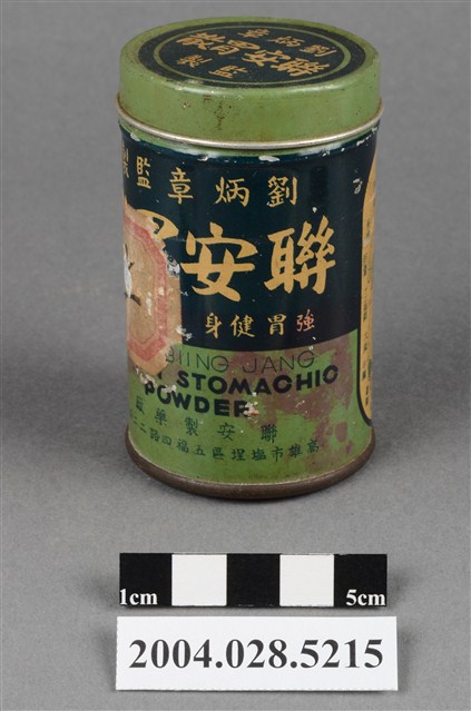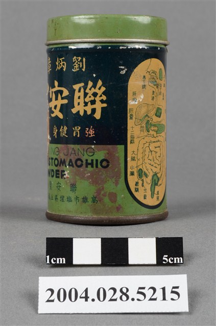 1. 本物件為聯安胃散之包裝。包裝為罐裝,金屬材質,有蓋。罐身印有劉炳章監製、聯安胃散、強胃健身、效能,用法用量、衛字255號等字樣和聨安製藥廠資訊。罐身有一人體透視圖,從耳下腺開始畫至直腸部位。蓋上印有劉炳章監製和聯安胃散字樣。