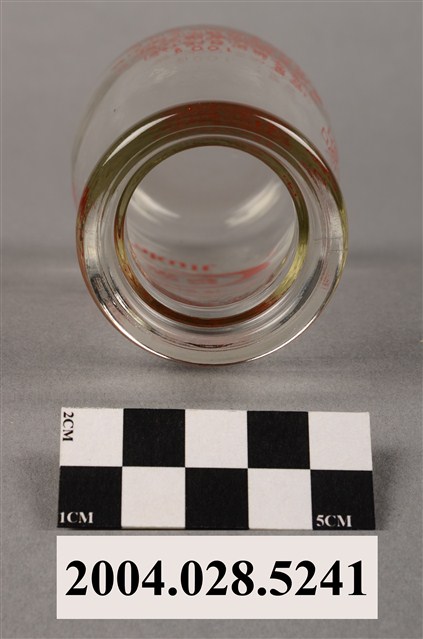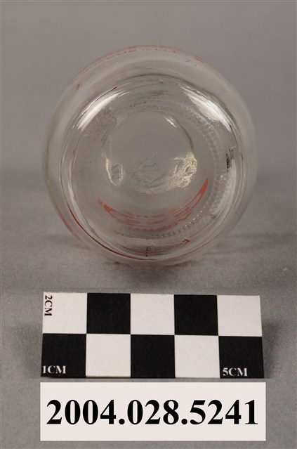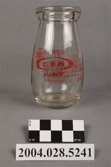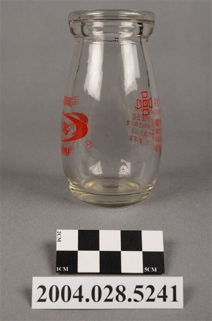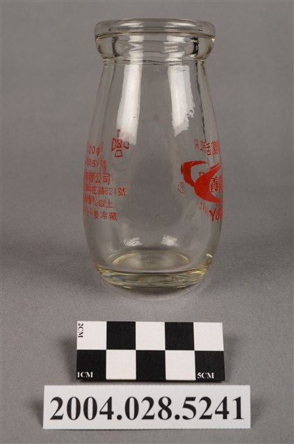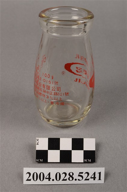 1.此件玻璃養樂多瓶由透明玻璃製成,長約5.4公分,寬約5.4公分,高約9.7公分。瓶口寬廣,溜肩並以微微曲線至瓶底。瓶身正面印有紅色標誌與文字,標誌為橢圓形框內印著「養樂多」,上方印著「活菌酵母乳」,下方印著「Yakult」,右下角有著圈內R字的註冊符號。瓶身背面印有「容量:100g」、「經新字第2-0151號」、「養樂多股份有限公司」、「工廠:台北縣新莊鎮中正路621號」、「非脂肪乳固體物3%以上」、「乳脂肪0.02%以上,要冷藏」等字樣,左上角印有四個口與田字組成的”代田標記“公司標誌。瓶底中央壓菱