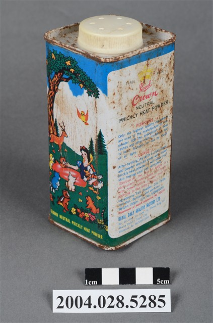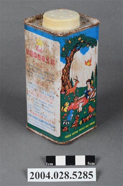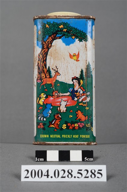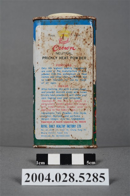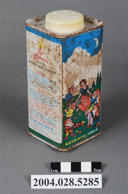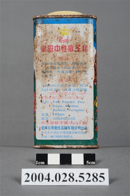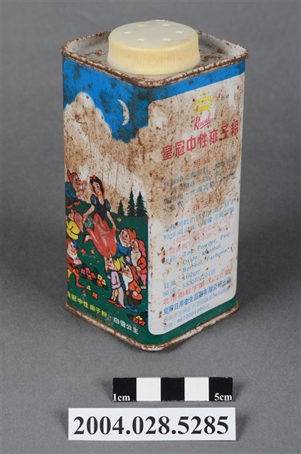 1.本件皇家日用衛生品廠有限公司製皇冠中性痱子粉,罐體通身以鐵片製作,罐蓋則以白色塑膠製作,呈長6公分,寬6.1公分,高12.9公分之直式正方形柱體。表面作彩色印刷,以白色為底,正面與背面以迪士尼白雪公主與七矮人的動畫圖片作為罐身裝飾,一側為白雪公主側臥於草地之上,另一側為白雪公主於草地嬉戲貌。底緣處印有「皇冠中性痱子粉 白雪公主」字樣,另一側底緣則為英文翻譯。罐身左右兩側為直式長方形白框底,頂端印上黃色皇冠圖案,下接「Royal」紅色字樣,為註冊商標。一側以中文說明用途、用法、成份等,另一側為英文翻譯。底緣則註明為皇家日用衛生品廠有限公司出品,地址為台北市木柵區中港路76巷34弄20號。底面部分黏貼有化粧品貨物稅證明貼紙之殘紙,頂面之罐蓋帶有6個平均圓孔,以左右旋轉方式打開或關閉圓孔。2.皇冠痱子粉為臺灣老牌痱子粉,可用於嬰兒身體保持乾燥減少尿布疹與痱子產生,在沐浴後使用可乾爽身體帶有芳香,另外也具有除臭功用,於理髮後灑於頸後可幫助去除黏貼皮膚之毛髮。