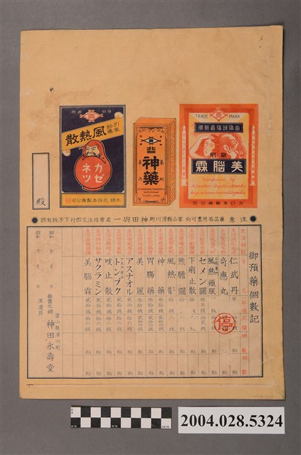 1.本物件為仁武丹寄藥包。此物件分兩面,一面有最上方印有註冊商標和正中間有一隻鹿站在山坡上之圖片,其他文字如仁武丹、臺灣總督府許可、鹿標、移出賣藥北日本製藥公司、富山縣滑川町、發賣元神田永壽堂等字樣。另一面上方有3藥品包裝,分別是美腦霖、神藥和風熱散。藥品包裝下方有注意事項,「藥品若用盡可向富山縣滑川町神田與一處寄信注文即付下不致有誤」。此面下方是一個表格「御預藥個數記」,上面有15種藥名以及各藥價格、主治效能和個數。