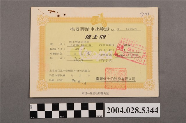 2004.028.5344 偉士牌機器腳踏車出廠證