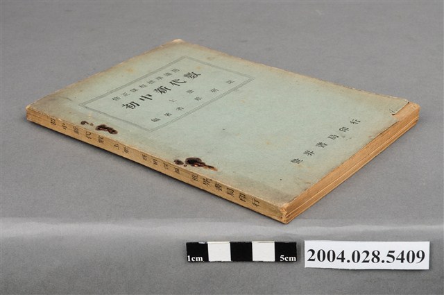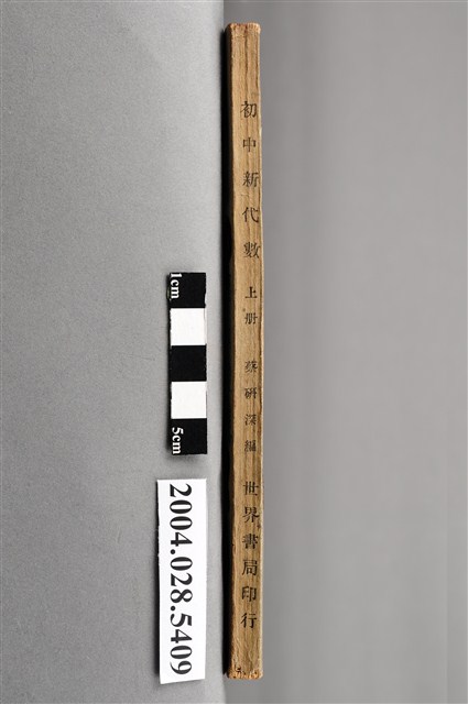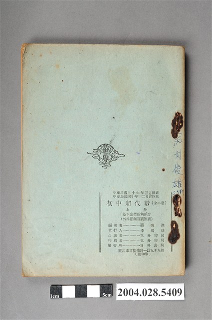 本物件為《初中新代數》上冊,蔡研深編著,臺北世界書局民國40年12月台四版印行。內容為數學代數的加減乘除各式運算法則與公式。書後有世界書局商標及版權資料,另有「□丙 劉俊雄 0547」字樣。