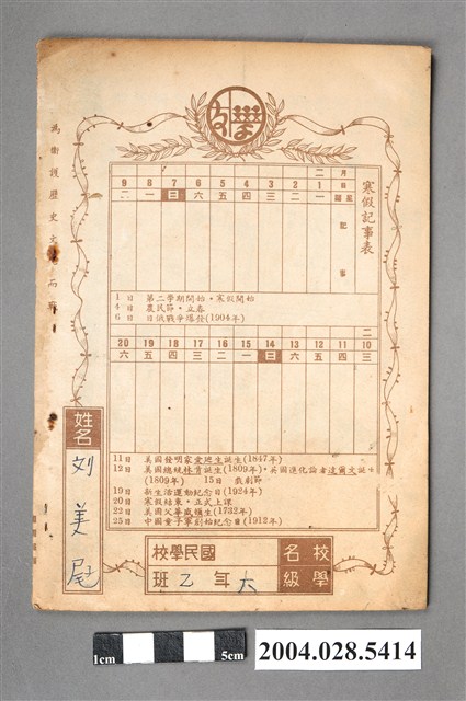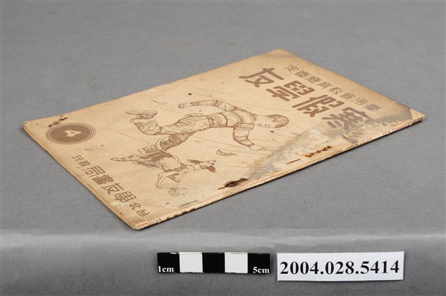 本文物為書籍,乃臺灣省教育廳審定通過的寒假作業簿:《寒假學友》第四冊,由台北學友書局編輯部編輯發行,背頁有寒假(二月份)記事表,以及校名、學級、姓名欄位,此物件有「六年乙班」、「劉美屘」字樣。顯示當時統一教材統一作業的教育政策。