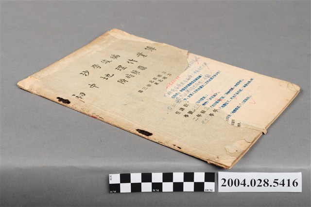 本文物為書籍,乃由知名政治地理學專家沙學浚編《初中地理作業簿》第三冊,內容範圍:北部地方與東北地方,附有暗射圖。編有練習題以供學生練習、教師批改。封面列有學校名稱、任課教師、學生性名學號年級