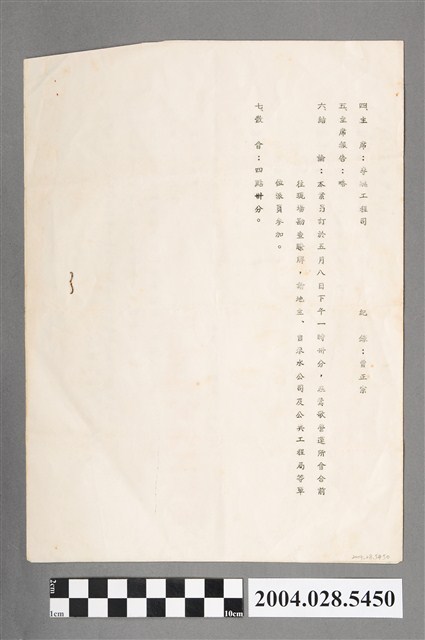 本物件為會議紀錄分送區分表,為紙質,為A4大小,正面有1個表格,有受文者、區分正本、區分副本,其中受文者有臺灣省自來水公司、臺灣省自來水公司第二區管理處、鶯歌服務所、臺北縣政府建設局、臺北縣政府地政科、陳查某、劉式金、施有枝、公共工程局企劃組、公共工程局北區測設隊、公共工程局工務組與公共工程局北區工程處,共有10處,除後4者僅需副本,其他6者皆要求正本;背面則為會議紀錄資料,有「四、主席:李總工程司」、「紀錄:曾正宗」、「五、主席報告:略」、「六、結論:本案另訂於五月八日下午一時卅分,在鶯歌運所會合前往現場勘察瞭解,請地主、自來水公司及公共工程局等單位派員參加。」、「七、參會:四點卅分。」黑色字樣。
