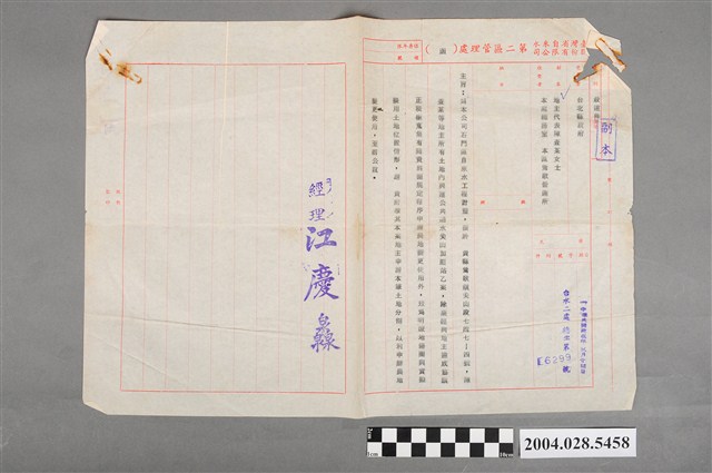 2004.028.5458 臺北縣政府受文臺灣省自來水公司陳查某土地事宜函副本