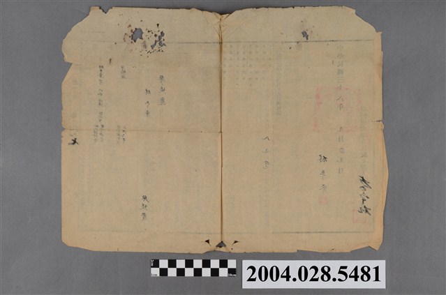 1.本件為「民國三十八年臺灣臺北地方法院公證書公字第九九七號」。保存狀況不佳,蟲蠹嚴重,中有十字摺痕,四邊磨損、破損嚴重。2.內容由聲請人林平銮有一函件寄與對造人廖張慶,需由在場人臺灣臺北地法院公證人李宇柱證明無誤。左側共有三方印,一為林平銮之印、二為李宇柱之印、三為臺灣臺北地方法院公證之印。