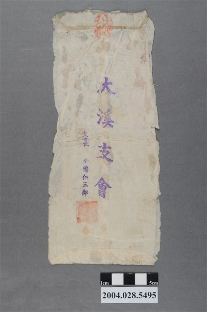 本件為大溪支會小嶋仁三郎寄鶯歌駅肥料保存者陳義方之信封。上蓋有「至急」之紅印。