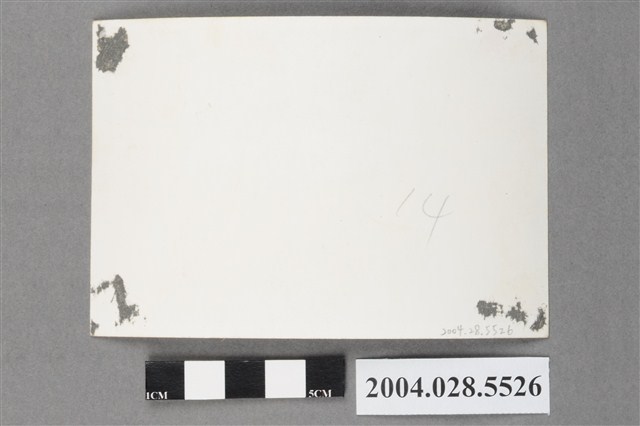 本物件是一張黑白照片,於室外拍攝。照片中共有13人,照片中只有1名女性,其餘皆為男性。本物件應與登錄號2004.028.5525為同一活動的照片。照片中唯一的女性位於正中間,身穿和服,搭配黑色手拿包,黑色短捲髮配上眼鏡。其餘男性皆著西裝打領帶,推斷此應為正式場合。照片背面四個角皆有破損。