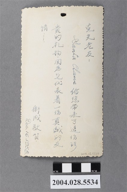 1.本件為「衛成致克光1959年年曆照片」,直式,單面印刷,正面四緣有摺痕,左下有汙損。正上方有鑽孔,推測此文物可能曾固定或吊掛於某處。2.四緣有波浪狀造型,上方有一「復興武德」飛彈照,下方為1959年的年曆,上有「HAPPY NEW YEAR」、「恭賀新禧」、「MERRY CHRISTMAS」、「慶祝聖誕」。3.背面有手寫字跡,直式直書,內容為「克光老友: Santa Claus 給您帶來了這份珍貴的禮物,因為它代表著一份真誠的友情…… 衛成敬賀 Dec. 16. 1958」。