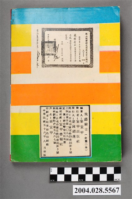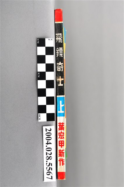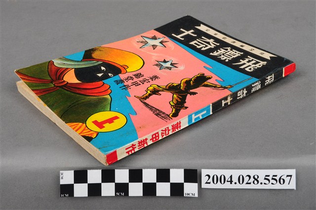 1.本件為黃錦堂《飛鏢奇士》上集,一共有上下集,由葉宏甲編輯故事大綱,由大徒弟黃錦堂繪畫,為一部中國武俠漫畫,內容敘述金龍、趙平等人與惡勢力蒙面人為了爭奪秘密地圖的交戰情形。封底有民國56年(1968)8月4日國立編譯館連環圖書畫審定執照的合格圖樣。
