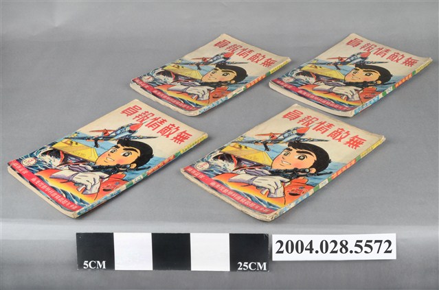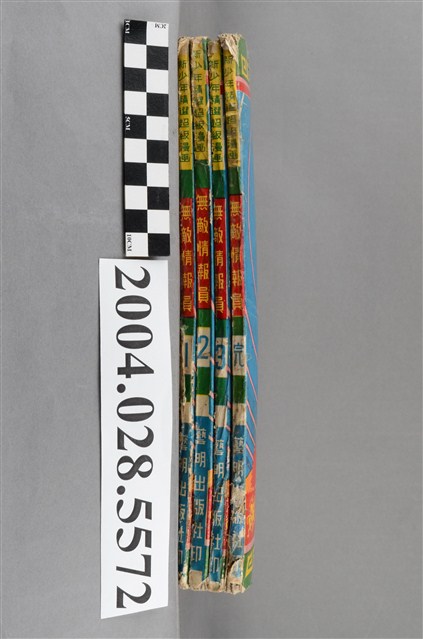 1.本件為藝明出版社《無敵情報員》全4集,敘述男主角擔任情報員工作,過程屢受阻難,最後化險為夷,順利完成任務的漫畫內容。4本的書背些微破損。2.漫畫是以圖像為呈現,具備繪畫、敘事、角色三要素,能因敘事而令圖像帶有個別意義、令作品內容獨立且完整的資訊載體。臺灣漫畫史上,民國55年(1966)實施「編印連環圖畫輔導辦法」嚴重衝擊漫畫創作,至民國76年(1987)解嚴,終止審查制度進入嶄新興盛的局面。