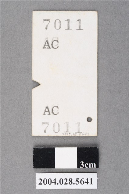 1.本物件為臺灣鐵路局復興號湖口至新竹站車票,為直式硬卡名片式車票,正面以藍色之左鐵路局局徽、右正臺灣島型為底紋;左下角圓孔為車票穿線孔;右緣有進站剪票缺口。正面上方打印「86.7.25」,為乘車日期;乘車日期下方印上「臺灣鐵路局」局銜;局銜下方印上「復興」,為列車車種;車種下方分3列印出「湖口站 至 新竹站」之起訖站資訊;起訖站下方橫印「限當日當次車有效」;再次行印上「票價25元」之票價資訊。背面上、下方各印有「7011」、「AC」字樣,前者代表車票編號,後者代表以1萬張車票為1組之第8組車票。