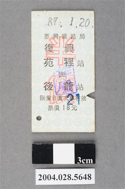 2004.028.5648 臺灣鐵路局復興號苑裡至後龍站車票