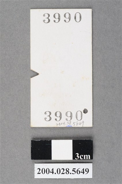 1.本物件為臺灣鐵路局復興號和通勤電車通用之南港至基隆站孩童票,為直式硬卡名片式車票,正面以藍色之左鐵路局局徽、右正臺灣島型為底紋;左下角圓孔為車票穿線孔;右緣有進站的剪票缺口;中央印有紅色之「孩」字樣。正面上方打印「87.12.13」,為乘車日期;乘車日期下方印上「臺灣鐵路局」局銜;局銜下方印上「復興/電車」,表示適用於復興號和通勤電車;車種下方分3列印出「南港站 至 基隆站」之起訖站資訊;起訖站下方橫印「限當日當次車有效」;再次行印上「票價14元」之票價資訊。背面上、下方各印有「3990」字樣,代表車票編號。