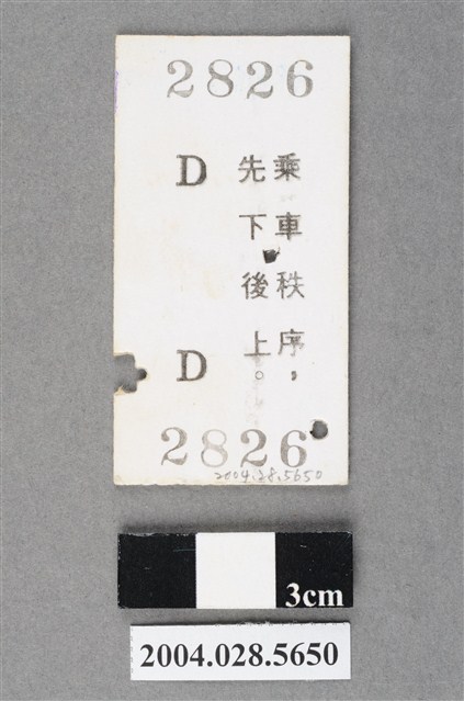 1.本物件為臺灣鐵路局貢寮至板橋站的普快車票,為直式硬卡名片式車票,正面以藍色之左鐵路局局徽、右正臺灣島型為底紋;左下角圓孔為車票穿線孔;右緣偏下處有進站的剪票缺口;中央偏左處有列車長驗票剪票孔。正面上方打印「86.9.18」,為乘車日期;乘車日期下方印上「臺灣鐵路局」局銜;局銜下方印上「普通、快車通用」,表示適用車種;車種下方分3列印出「貢寮站 至 板橋站」之起訖站資訊;起訖站下方橫印「限發售當日有效」;再次行印上「票價66元」之票價資訊。背面上、下方各印有「2826」、「D」字樣,前者代表車票編號,後者代表以1萬張車票為1組之第5組車票。中央偏右處由右而左以兩行直印「乘車秩序,」、「先下後上。」標語。