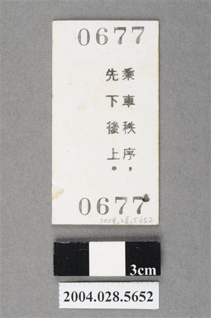1.本物件為臺灣鐵路局四腳亭至基隆站的普快孩童票,為直式硬卡名片式車票,正面以藍色之左鐵路局局徽、右正臺灣島型為底紋;左下角圓孔為車票穿線孔;右緣下方有未完全剪斷之進站剪票缺口;中央印有紅色之「孩」字樣。正面上方打印「87.12.4」,為乘車日期;乘車日期下方印上「臺灣鐵路局」局銜;局銜下方印上「普通、快車通用」,表示適用車種;車種下方分3列印出「四腳亭站 至 基隆站」之起訖站資訊;起訖站下方橫印「限發售當日有效」;再次行印上「票價6元」之票價資訊。背面上、下方各印有「0677」字樣,代表車票編號。中央偏右處由右而左以兩行直印「乘車秩序,」、「先下後上。」標語。