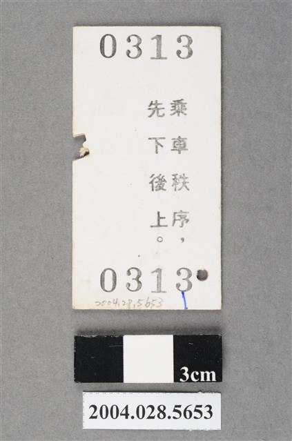 1.本物件為臺灣鐵路局侯硐至基隆站的普快孩童票,為直式硬卡名片式車票,正面以藍色之左鐵路局局徽、右正臺灣島型為底紋;左下角圓孔為車票穿線孔;右緣有進站剪票缺口;中央印有紅色之「孩」字樣。正面上方打印「87.12.19」,為乘車日期;乘車日期下方印上「臺灣鐵路局」局銜;局銜下方印上「普通、快車通用」,表示適用車種;車種下方分3列印出「侯硐站 至 基隆站」之起訖站資訊;起訖站下方橫印「限發售當日有效」;再次行印上「票價10元」之票價資訊。背面上、下方各印有「0313」字樣,代表車票編號。中央偏右處由右而左以兩行直印「乘車秩序,」、「先下後上。」標語。