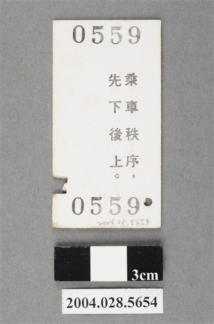 1.本物件為臺灣鐵路局侯硐至基隆站的普快孩童票,為直式硬卡名片式車票,正面以藍色之左鐵路局局徽、右正臺灣島型為底紋;左下角圓孔為車票穿線孔;右下緣有進站剪票缺口;中央印有紅色之「孩」字樣。正面上方打印「88.5.2」,為乘車日期;乘車日期下方印上「臺灣鐵路局」局銜;局銜下方印上「普通、快車通用」,表示適用車種;車種下方分3列印出「侯硐站 至 基隆站」之起訖站資訊;起訖站下方橫印「限發售當日有效」;再次行印上「票價10元」之票價資訊。背面上、下方各印有「0559」字樣,代表車票編號。中央偏右處由右而左以兩行直印「乘車秩序,」、「先下後上。」標語。