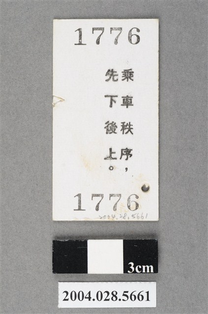1.本物件為臺灣鐵路局四腳亭至基隆站的普快孩童票,為直式硬卡名片式車票,正面以藍色之左鐵路局局徽、右正臺灣島型為底紋;左下角圓孔為車票穿線孔;右緣有未完全剪斷之進站剪票缺口;中央印有紅色之「孩」字樣。正面上方打印「88.7.28」,為乘車日期;乘車日期下方印上「臺灣鐵路局」局銜;局銜下方印上「普通、快車通用」,表示適用車種;車種下方分3列印出「四腳亭站 至 基隆站」之起訖站資訊;起訖站下方橫印「限發售當日有效」;再次行印上「票價6元」之票價資訊。背面上、下方各印有「1776」字樣,代表車票編號。中央偏右處由右而左以兩行直印「乘車秩序,」、「先下後上。」標語。