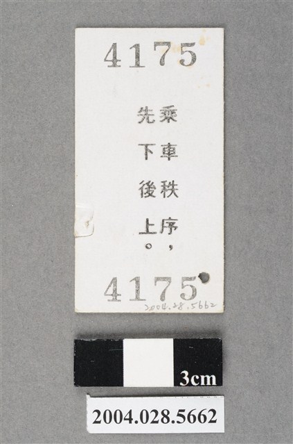 1.本物件為臺灣鐵路局牡丹至瑞芳站的普快孩童票,為直式硬卡名片式車票,正面以藍色之左鐵路局局徽、右正臺灣島型為底紋;左下角圓孔為車票穿線孔;右緣偏下方有未完全剪斷之進站剪票缺口;中央印有紅色之「孩」字樣。正面上方打印「88.9.1」,為乘車日期;乘車日期下方印上「臺灣鐵路局」局銜;局銜下方印上「普通、快車通用」,表示適用車種;車種下方分3列印出「牡丹站 至 瑞芳站」之起訖站資訊;起訖站下方橫印「限發售當日有效」;再次行印上「票價6元」之票價資訊。背面上、下方各印有「4175」字樣,代表車票編號。中央由右而左以兩行直印「乘車秩序,」、「先下後上。」標語。