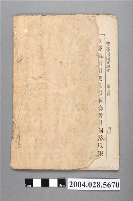 本件為瑞成書局發行《初等實用國文讀本》第五冊,封面上有「附注國音」字樣,發行時間為民國25年(1936)4月,共計50課,內頁版次分上下兩欄,上方為生字欄,並標註注音符號,下方則是課文,課文印有句讀符號,根據課文內容,印有黑白插圖,例如第五課「黃帝」,印有中國古代帝王圖片。瑞成書局創建於大正元年(1912),原址位於臺中市綠川町(今臺中第一市場),民國70年代遭逢祝融燒毀,搬遷至臺中市中山公園(今臺中公園)附近。戰前以經銷上海中西書局、千頃堂書局、大一統書局等漢文書籍為主要業務,類型包括讀本、辭典、章回小說、兒童用書、古典文學、醫書等,同時亦發行出版漢文教材。
