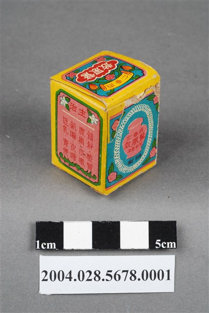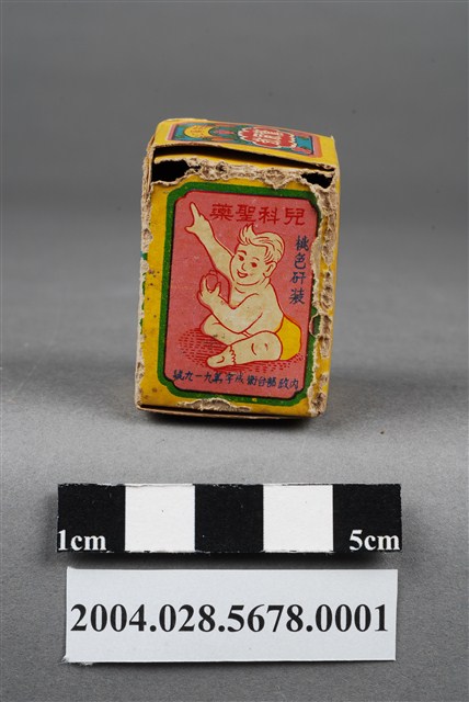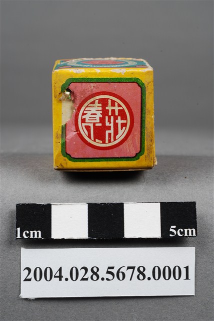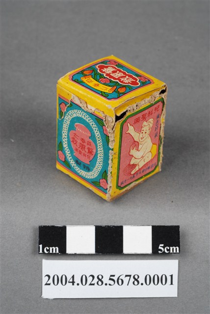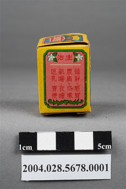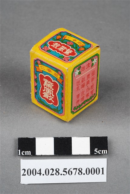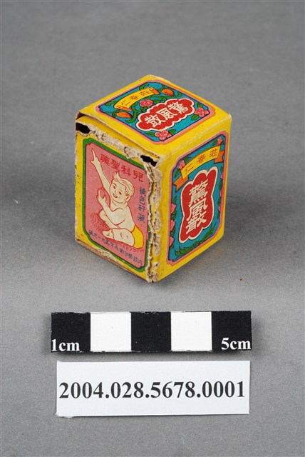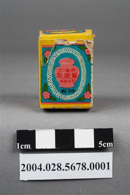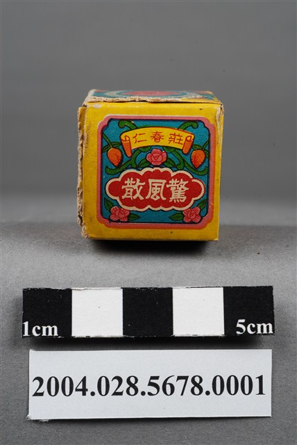 1.本物件為莊春仁驚風散外盒。包裝紙盒為長方體,四個側面分別印有莊春仁驚風散、兒科聖藥、桃色矸裝和內政部臺衛成字第919號等字樣,以及主治內容和一孩童手拿藥罐之圖案。盒頂印有莊春仁驚風散字樣,盒底則印有莊春仁字樣。