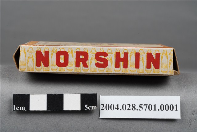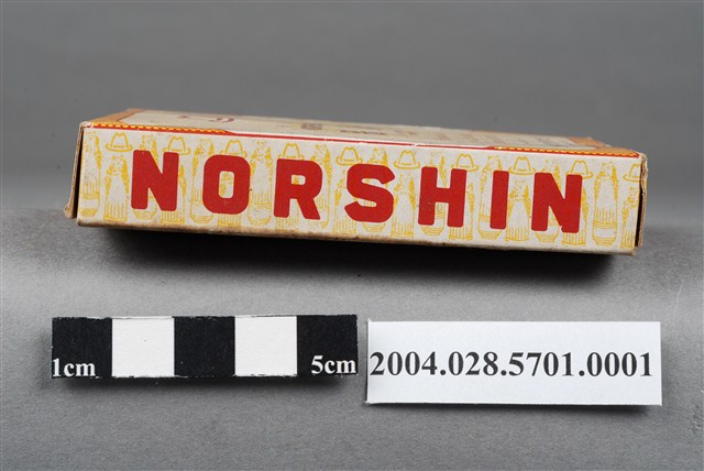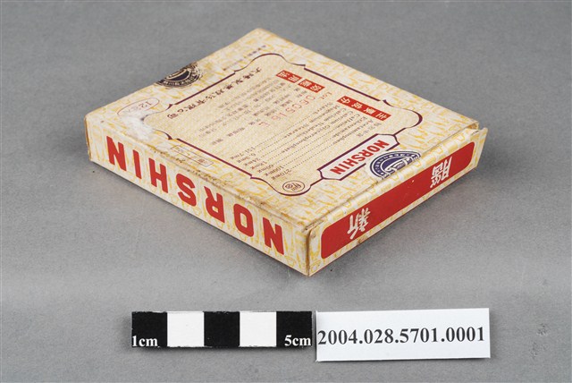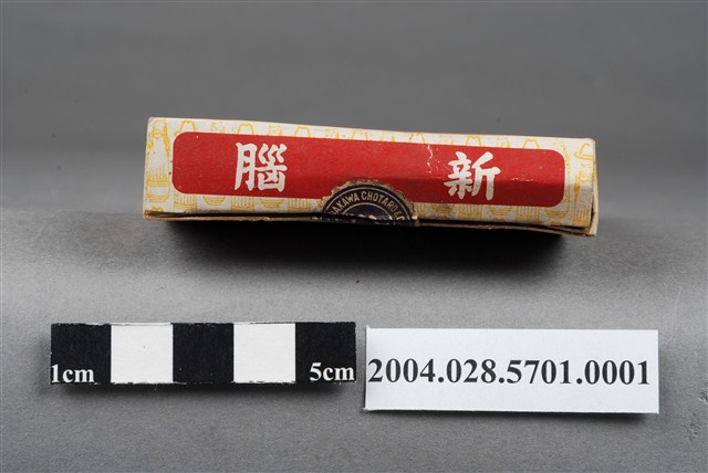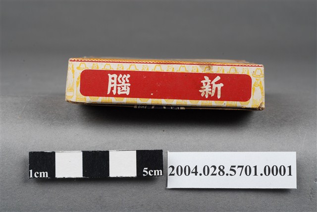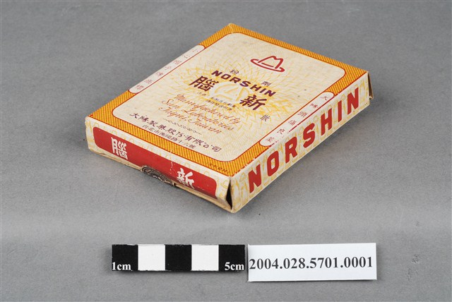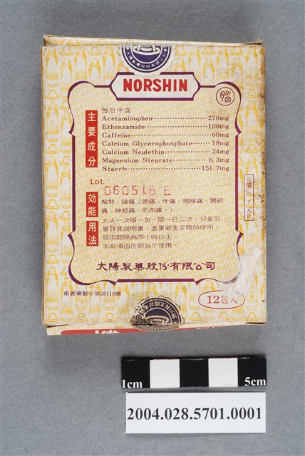 1.本物件為大陽製藥腦新散外盒。外盒為紙製品。外盒封面最上方有帽子圖案之商標,其下印有粉劑、NORSHIN、腦新散、大陽頭痛良藥和小心帽子牌商標等字樣,以及製藥廠資訊。背面則印有主要成分、效能、用法內容和衛署藥製字第28118號、定價60元整和12包入等字樣。上下側面印有腦新,左右側面印有NORSHIN。