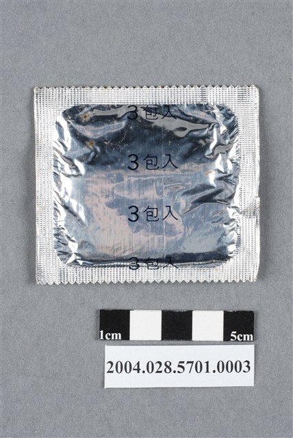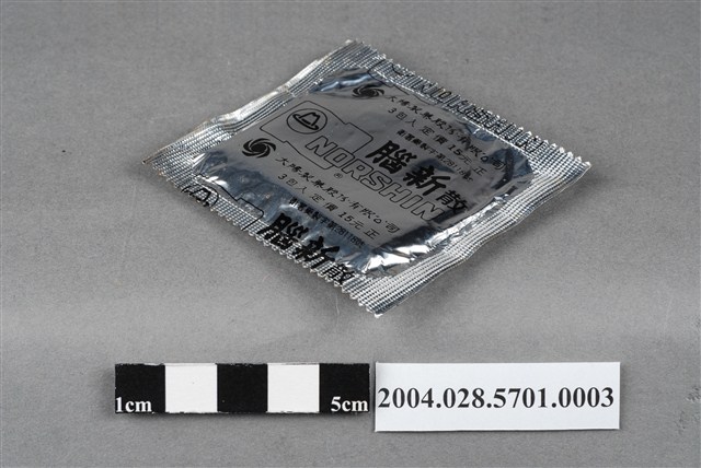 1.本物件為大陽製藥腦新散之藥包。藥包外觀為銀色,無法判斷材質。一面印有3包定價15元正、衛署藥製字第28118號、腦新散、NORSHIN和大陽股份有限公司等字樣。另一面則印有3包入字樣。