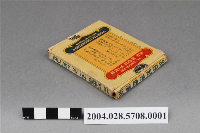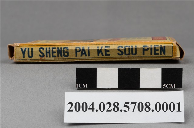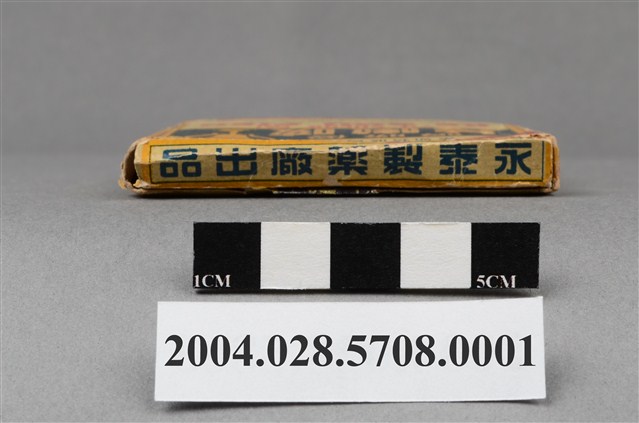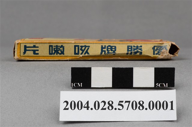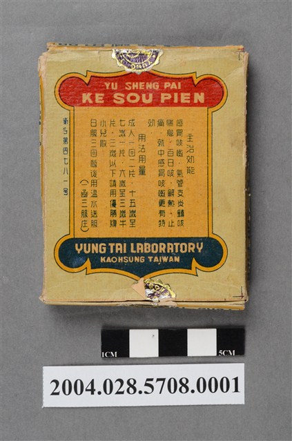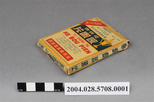1. 本物件為優勝牌咳嗽片外盒。外盒為紙製品,封面印有註冊商標,以及感冒咳特效藥、鎮咳嗽感風邪綜合劑、最新感冒咳特效藥、優勝牌咳嗽片、YU SHENG PAI KE SOU PIEN、THIS MEDICINE PREPARED FROM THE SPECIAL FOREIGN MEDICAL COMPOUNDS IS A SPECIFIC FOR INFLUENZA & COUGH和永泰製藥廠出品等字樣。背面印有主治效能(感冒咳嗽、氣管支炎鎮咳喘息等)和用法用量內容,以及衛字第4781號、製藥廠英文資訊和品名字樣。側面分別印有中英文之藥品名和製藥廠名。背面上下開合處貼有封口標籤。