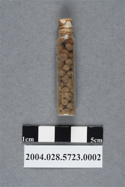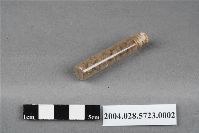 1. 本物件為正長生沙氣丸之藥瓶。藥瓶為透明無色,圓柱體形,無法判斷材質,瓶塞似木質材料。瓶內有深棕色丸狀物。