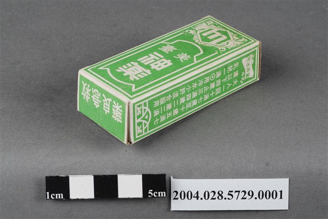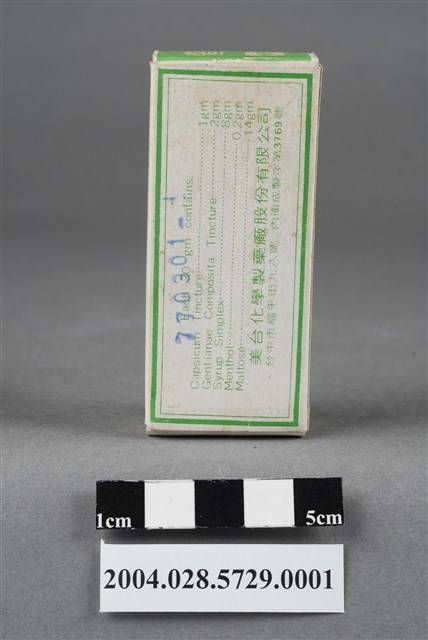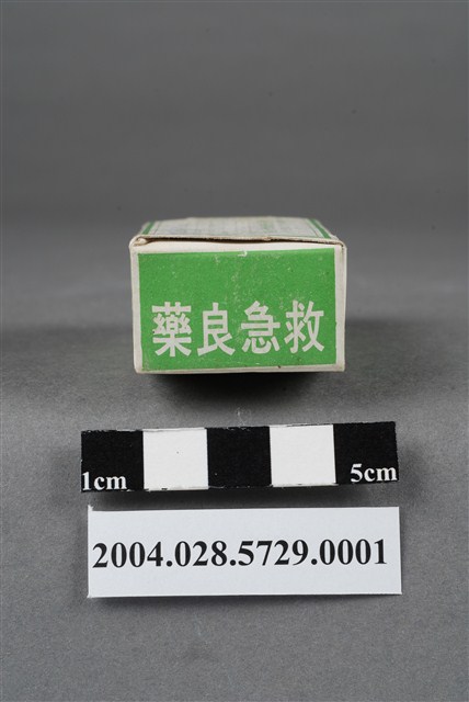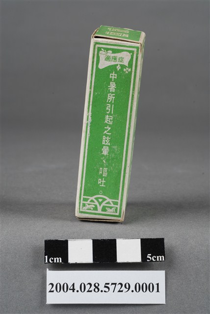 1. 本物件為美臺神藥外盒。外盒為綠色紙製品,封面印有美臺神藥字樣,其他面則印有適應症(中暑所引起之昡暈、嘔吐)、用法用量、成分和製藥廠資訊內容,以及內衛成製字第3769號。有一邊盒蓋印有成藥兩字,另一盒蓋上印有救急良藥字樣。