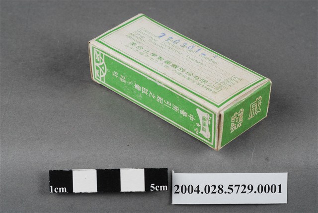 2. 本產品標有內衛成製字第3769號,應為西元1949-1971年許可字號發證的產物,但在衛生福利部食品藥物管理署查無此藥資料。
