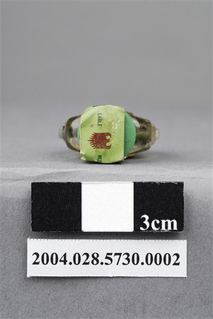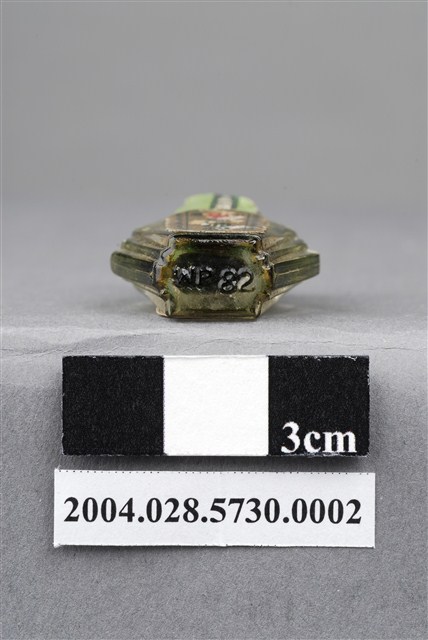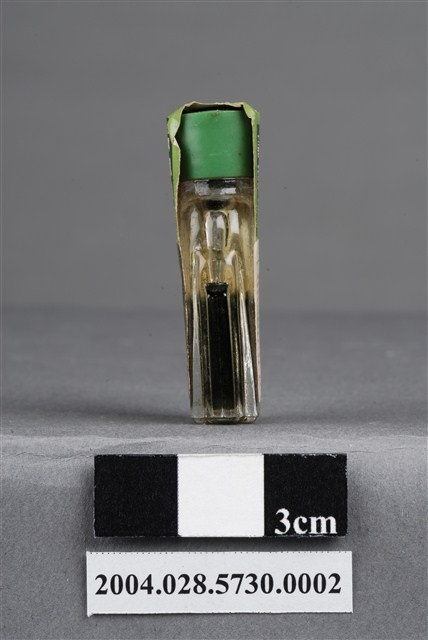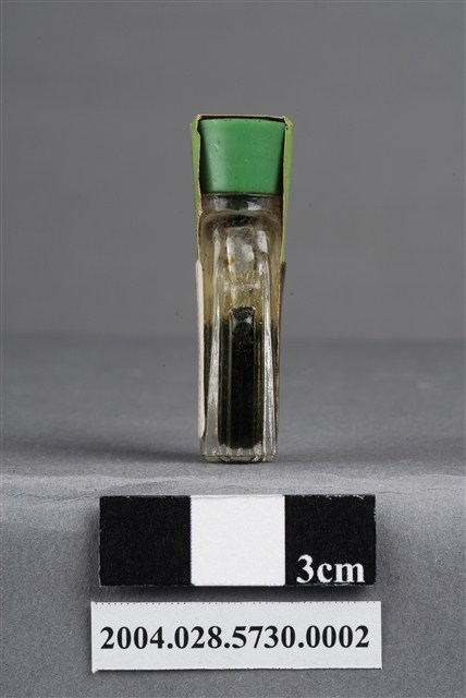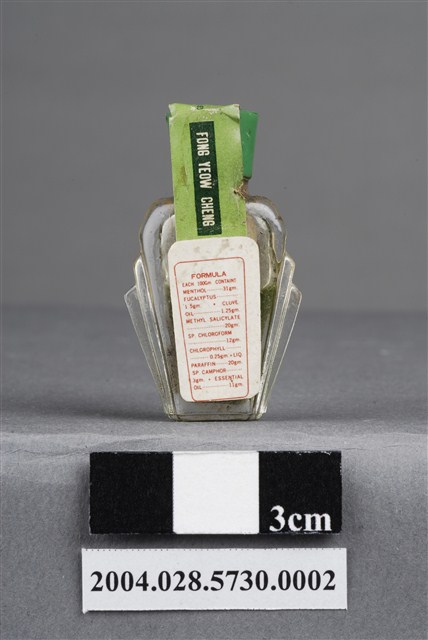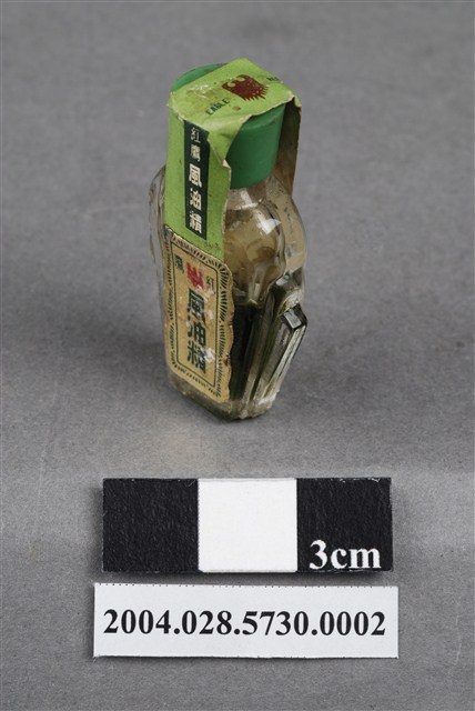 1. 本物件為紅鷹風油精之藥瓶。瓶身為透明,似玻璃材質,瓶蓋為綠色。瓶身與瓶蓋有一封條貼紙,印有中英文紅鷹風油精字樣。瓶身有一銀色貼紙,印有商標與風油精字樣。瓶身另一面有白色貼紙,印有英文成分內容。瓶內有液體,似深綠色。