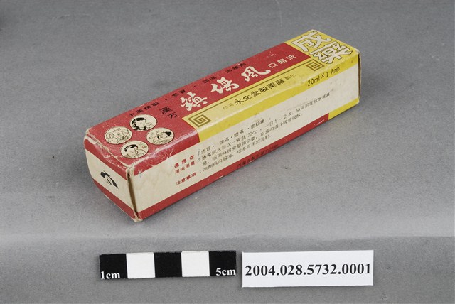 1. 本物件為鎮傷風口服液外盒。封面印有漢方、鎮傷風口服液、成藥、中藥精製和感冒頭痛治療劑字樣,以及四張生病病症的圖片。有一面印有英文封面。其他面則印有適應症、用法用量、注意事項和成分內容,以及內衛成製字第3124號。盒蓋上印有註冊商標。