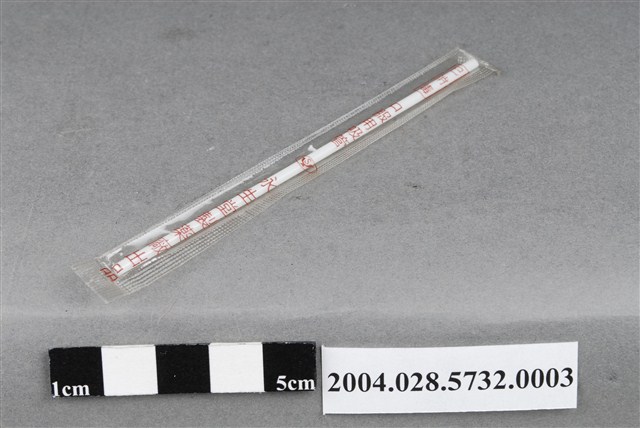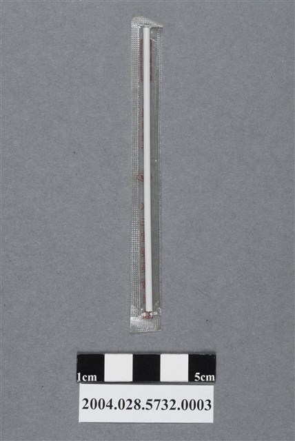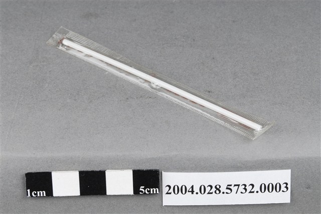 1. 本物件為鎮傷風口服液口服用吸管。吸管為白色塑膠材質,外層包有透明塑膠套。塑膠套上印有已消毒、口服用吸管、永生堂至藥廠出品字樣和註冊商標。