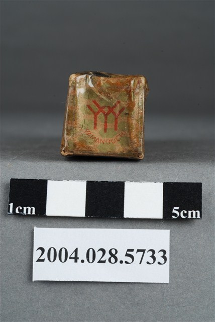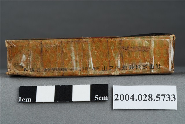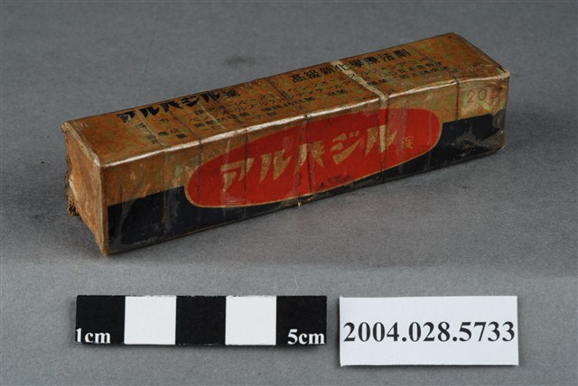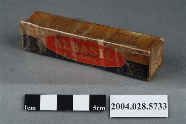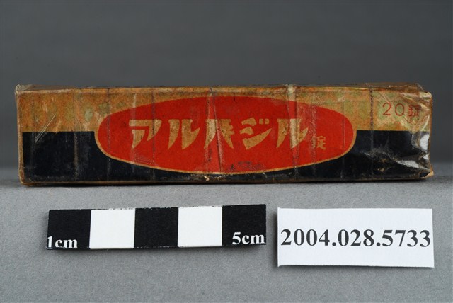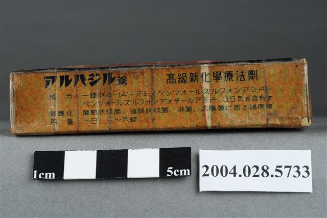 本物件為ALBASIL錠。包裝為長條盒狀,土黃色,似紙類材質。包裝有英文和日文封面,英文封面印有ALBASIL和20 TABLETTEN字樣,日文封面印有アルバジル錠和20錠字樣。其他兩面印有高級新化學療法劑字樣,以及成分、適應症、用量與製藥廠資訊等內容。