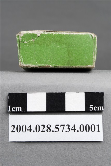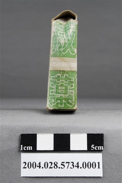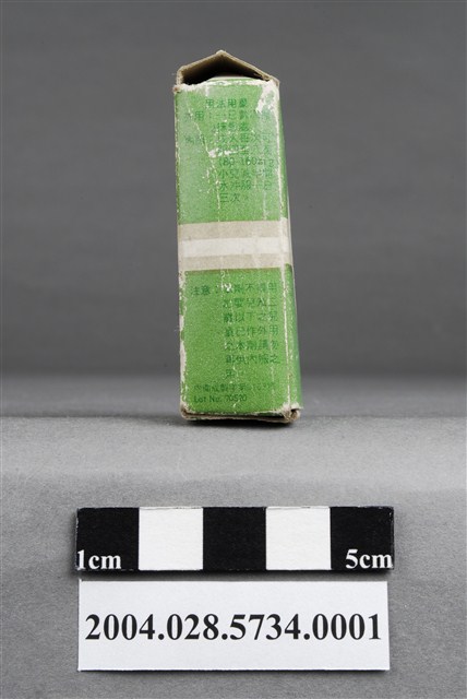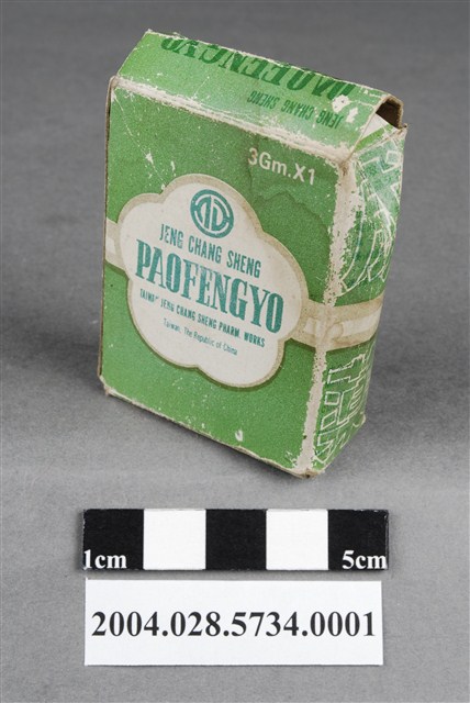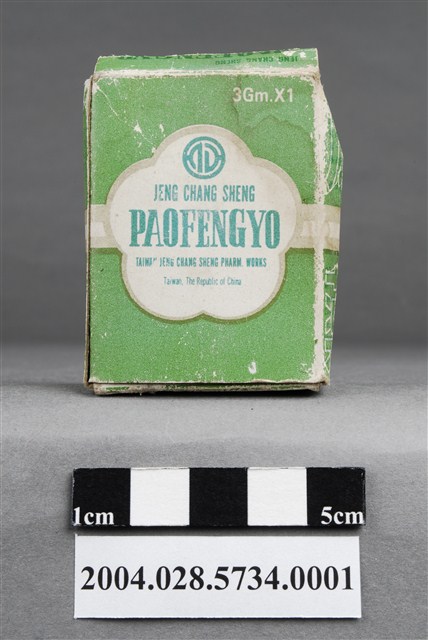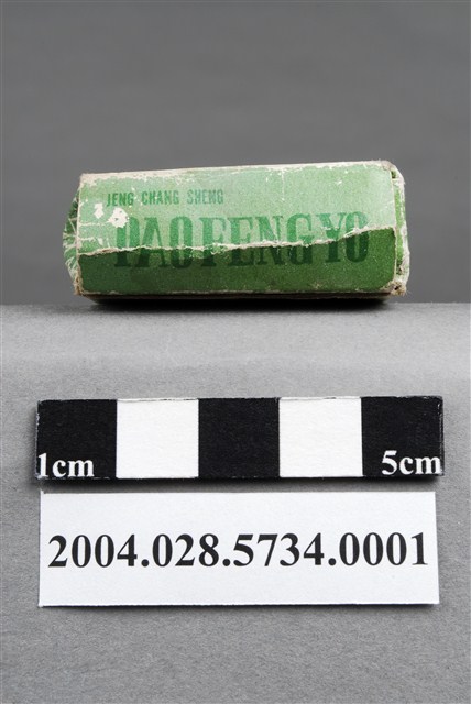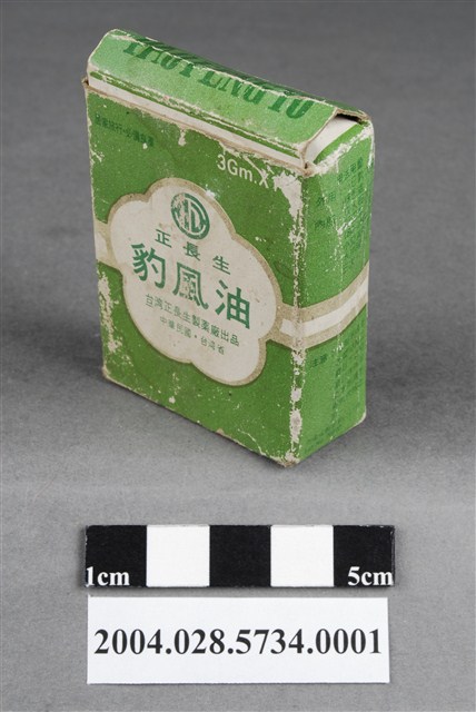 1. 本物件為豹風油外盒。外盒為綠色紙盒。封面印有正長生豹風油和居家旅行必備良藥字樣,以及註冊商標和製藥廠資訊。背面則印有英文藥品名和製藥廠資訊。兩側面印有主治效能、成分、用法用量和注意事項內容,以及成藥兩字。