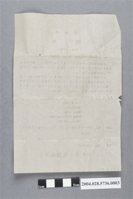 1. 本物件為明朗目藥水說明書。說明書為單張紙單面有字。內容印有藥品說明、主成分、效能、用法用量和包裝等內容。