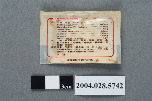 2. 本產品標有衛署藥製字第07337號,應為西元1971-2013年許可字號發證的產物,故此產品應為西元1971年之後生產,但在衛生福利部食品藥物管理署查無此藥資料。