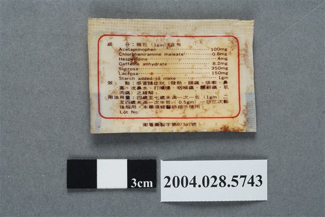 1. 本物件為小兒嗽熱好。包裝封面印有商標與一幼兒照片頭像,另有文字,分別是小兒用綜合感冒劑、1Gm、民安、小兒咳熱好、顆粒、Child anticold granule和M.A.字樣,以及製藥廠資訊。背面印有成分、效能、用法用量內容和衛署藥製字第07337號。