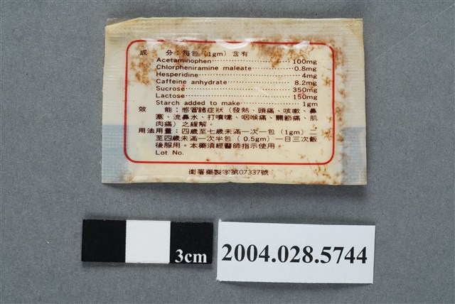 1. 本物件為小兒嗽熱好。包裝封面印有商標與一幼兒照片頭像,另有文字,分別是小兒用綜合感冒劑、1Gm、民安、小兒咳熱好、顆粒、Child anticold granule和M.A.字樣,以及製藥廠資訊。背面印有成分、效能、用法用量內容和衛署藥製字第07337號。